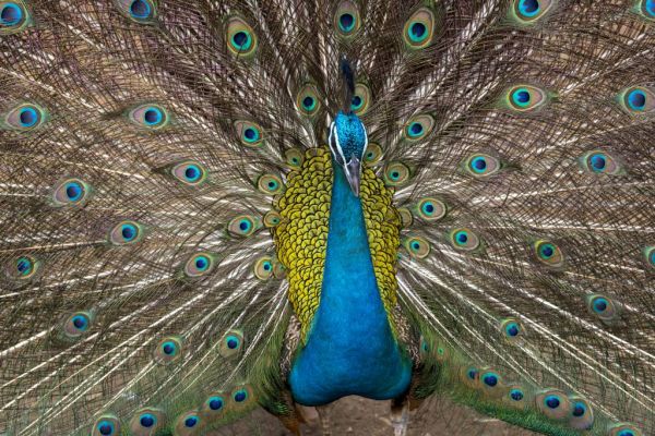 En fargerik påfugl med fjær på tapetet. Mørke, dyrpe farger forvandler et rom til et varmt miljø med dette springen på veggen.