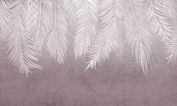 Hvite hengende palmeblader på en lys lilla bakgrunn i betong tekstur.