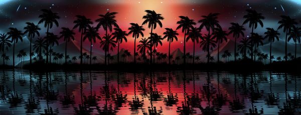 Nattlandskap med palmer med rød himmel med stjerner ved vannet