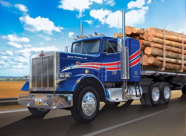 En kraftig blå lastebil, lastet med tømmerstokker, kjører over en solfylt motorvei. De stramme linjene og glinsende aksentene symboliserer styrke og pålitelighet i et vidt amerikansk landskap.