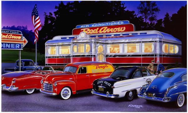 Dette bildet tar deg med til en nostalgisk kveld på den klassiske "Red Arrow Diner", hvor retro sjarm og vintage stil møtes.