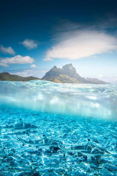 Krystallklart vann avslører en gruppe revhaier som elegant svømmer gjennom en turkis lagune, med en tropisk øy og imponerende fjelltopper i bakgrunnen.