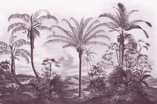 I dette tropiske designet smelter dype røde nyanser sammen med de myke konturene av palmer og bakker, noe som fremkaller en følelse av luksus og raffinement. De varme bordeaux- og vinfargene kontrasterer subtilt med de lysere pastellfargene, noe som skaper et livlig, men likevel harmonisk bilde. Dette designet er spesielt egnet for interiører som kan bruke et statelig eller romantisk preg. Tenk på klassiske eller art-deco-stiler, med mørke tremøbler, marmor detaljer og fløyelsstoffer i matchende farger. Også i et moderne interiør kan dette mønsteret danne en spennende kontrast når det kombineres med stramme, lyse møbler. De rike fargene og tropiske formene inviterer til stemningsfull belysning, som vegglamper i messing eller gull. I stuen gir dette designet en hjertelig og luksuriøs velkomst, mens det i soverommet skaper en sensuell, avslappende atmosfære. Med dette mønsteret bringer du et stykke tropisk storhet inn i hjemmet.