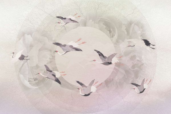 Denne fortryllende designen skildrer kraner i full flukt, et symbol på nåde og harmoni. Fuglene beveger seg gjennom en eterisk bakgrunn av pastellrosa, blå og grønne toner, subtilt forsterket av myke blomsteraksenter. Sirkulære lag gir dybde og skaper en følelse av uendelig plass. Kombinasjonen av naturlige elementer og luftige farger gir en følelse av fred og balanse til ethvert rom.
