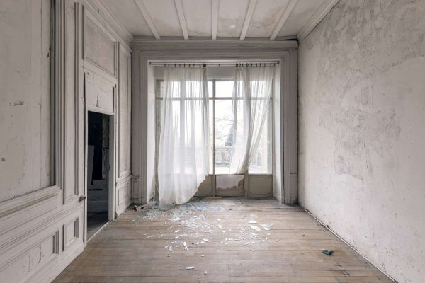 Den tidligere speilsalen i et forlatt slott i Frankrike. Den dagen vi besøkte slottet, var det uhyggelig stille. Denne bygningen har hatt en innholdsrik historie. Det var en privatbolig, et militærsykehus under første verdenskrig, et sanatorium og til slutt et treningssenter før det ble helt forlatt for rundt 15 år siden.