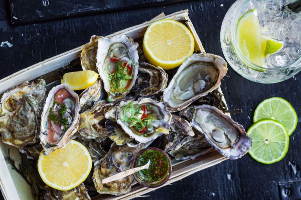 vakret atmosfærisk bilde av en bolle med østers og sitroner