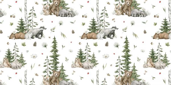 Hvilede bjørner, en årvåken grevling, og en ugle som hviler på en gren, danner sammen med andre skogbeboere et fredelig skogsamfunn. Omringet av furutrær og aksetuert med skogflora, skaper denne komposisjonen en følelse av fred og avslapping i den naturlige verden.