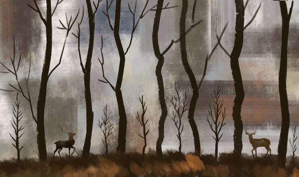 I en verden av abstrakte former og myke fargeoverganger står en hjort rolig blant de nakne trærne. Den diffuse bakgrunnen antyder en tåkete morgen eller en stille kveldsskumring, hvor den naturlige verden roer seg ned og hilser dagen velkommen eller avslutter den.