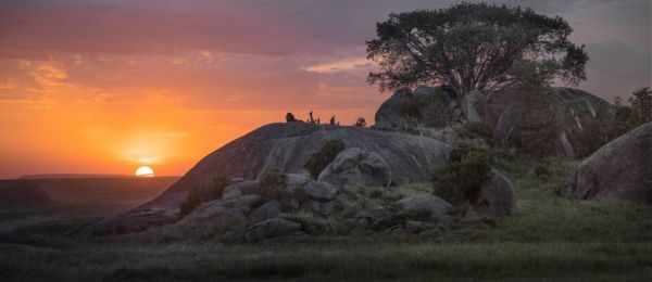 solnedgang over savannen. I forgrunnen ser du åser og en løvehane.