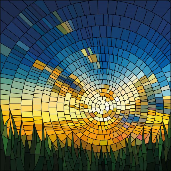 En solnedgang ved en plen i mosaikkstil. Kombiner dette fototapetet i hjemmet ditt og fullfør rommet.