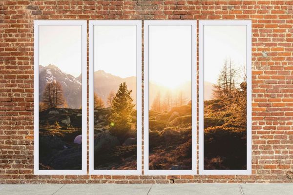 Dette imponerende designet viser et fjellandskap som våkner under en varm soloppgang. Solen kaster sine første stråler over en skråning dekket av furu og lerk, mens silhuettene av fjellene tegner seg mot en klar himmel. Den myke tåken i det fjerne og det gyldne lyset som glir over steinene og trærne, gir bildet en nesten magisk atmosfære. Nede til venstre står et telt skjult blant det grønne – en subtil henvisning til eventyr og forbindelse med naturen. Bildet er delt opp i fire høye paneler, noe som gir rytme og en imponerende vertikal utstråling. Dette gjør at designet passer perfekt inn i moderne, industrielle eller rustikke interiører. I et industrielt rom – tenk mursteinsvegger, stål og betong – tilfører dette designet varme og naturlig kontrast. I en hytte- eller landlig stil kommer forbindelsen med utelivet enda sterkere frem. Ideelt for stuer med høye tak, en åpen hall eller en stemningsfull vegg i et soverom eller studio. Kombiner med varme tretoner, grove linestoffer, lærstoler eller myke pledd for å fremheve den naturlige og koselige atmosfæren. Fargetonene – som varierer fra dyp mørkegrønn og steingrå til gullgul og kobber – gir et rikt, innbydende utseende. Bildet fremkaller en følelse av frisk fjelluft, stillhet og indre ro. Dette designet er ikke bare dekorativt, men også inspirerende: en daglig påminnelse om skjønnheten i øyeblikket rett før verden våkner.