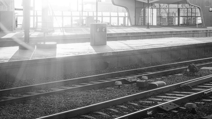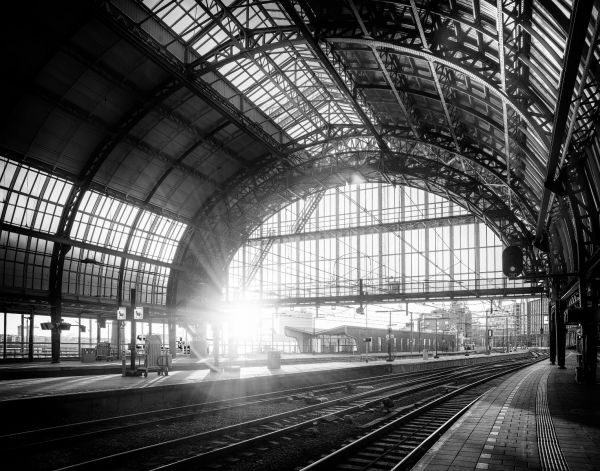 Soloppgang på en tom stasjon i svart-hvitt med tykke solstråler