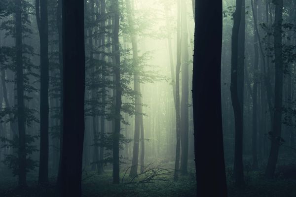 En solstråle i en mørk skog, et mystisk skoglandskap.