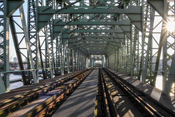 Et imponerende bilde av den historiske Hefbroen i Rotterdam, der stålstrukturer og jernbaneskinner møtes i et symmetrisk perspektiv. Solstrålene faller lekent gjennom de metalliske strukturene, noe som skaper et dynamisk spill av lys og skygge. Dypdevirkningen og industrielle detaljer gjør dette til et kraftfullt og tidløst bybilde.