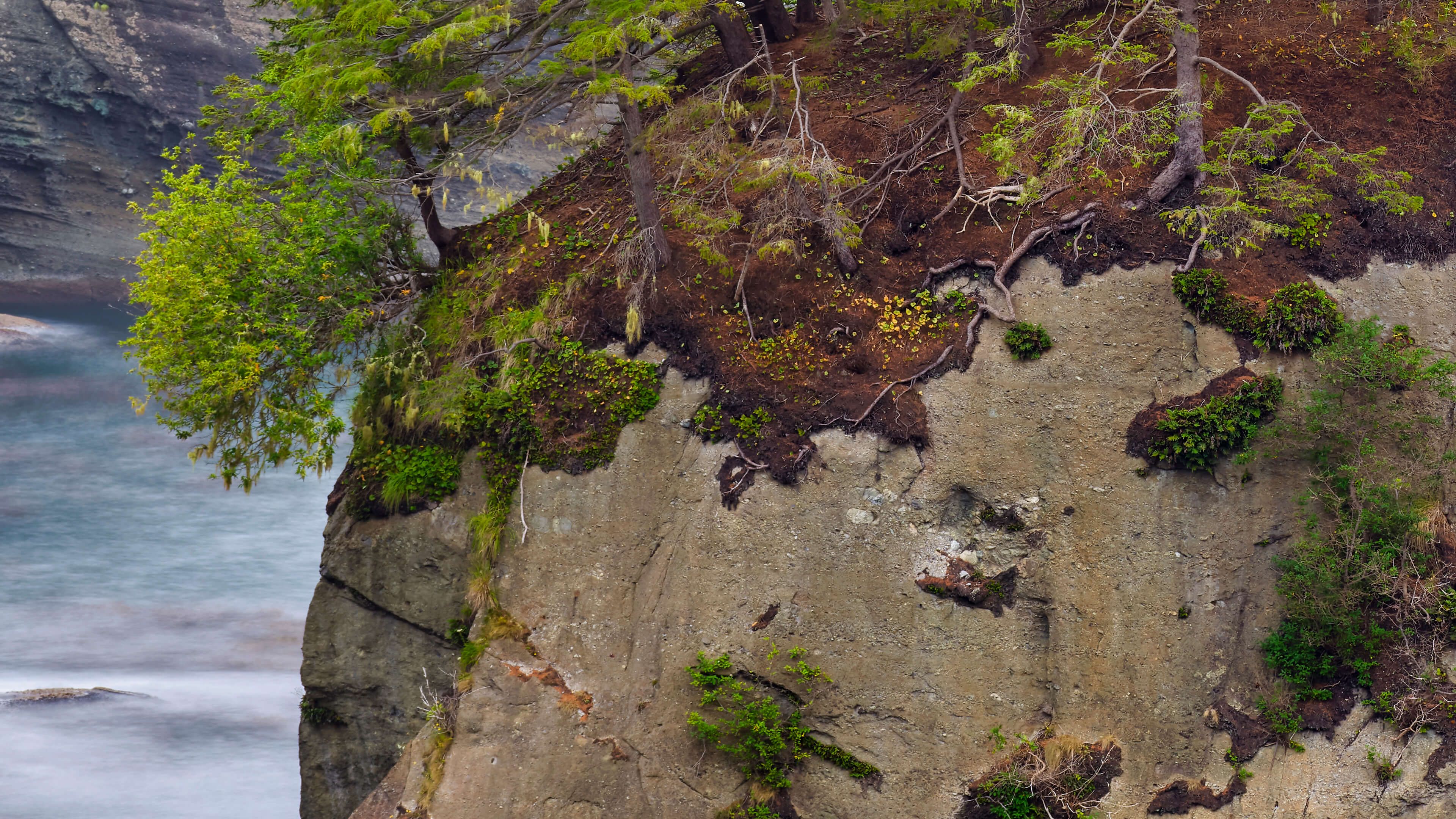 Detaljert bilde av to store vegetative røde fjellformasjoner langs kysten