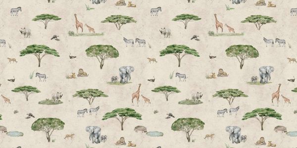 Et solfylt savanne-mønster med ville dyr som giraffer, elefanter, løver og sebraer, spredt mellom akasietrær og åpne gressletter. Bakgrunnen og detaljerte illustrasjoner fremkaller varmen og vidstraktenheten av den afrikanske savannen, ideelt for et eventyrlig og naturlig preg i ethvert rom.