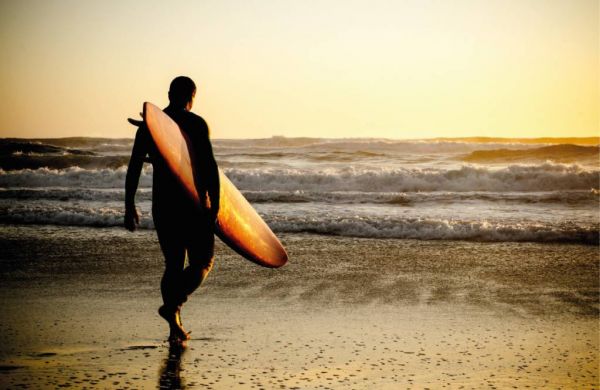 Fototapet av en vandrende surfer med et surfebrett under armen på stranden med en solnedgang
