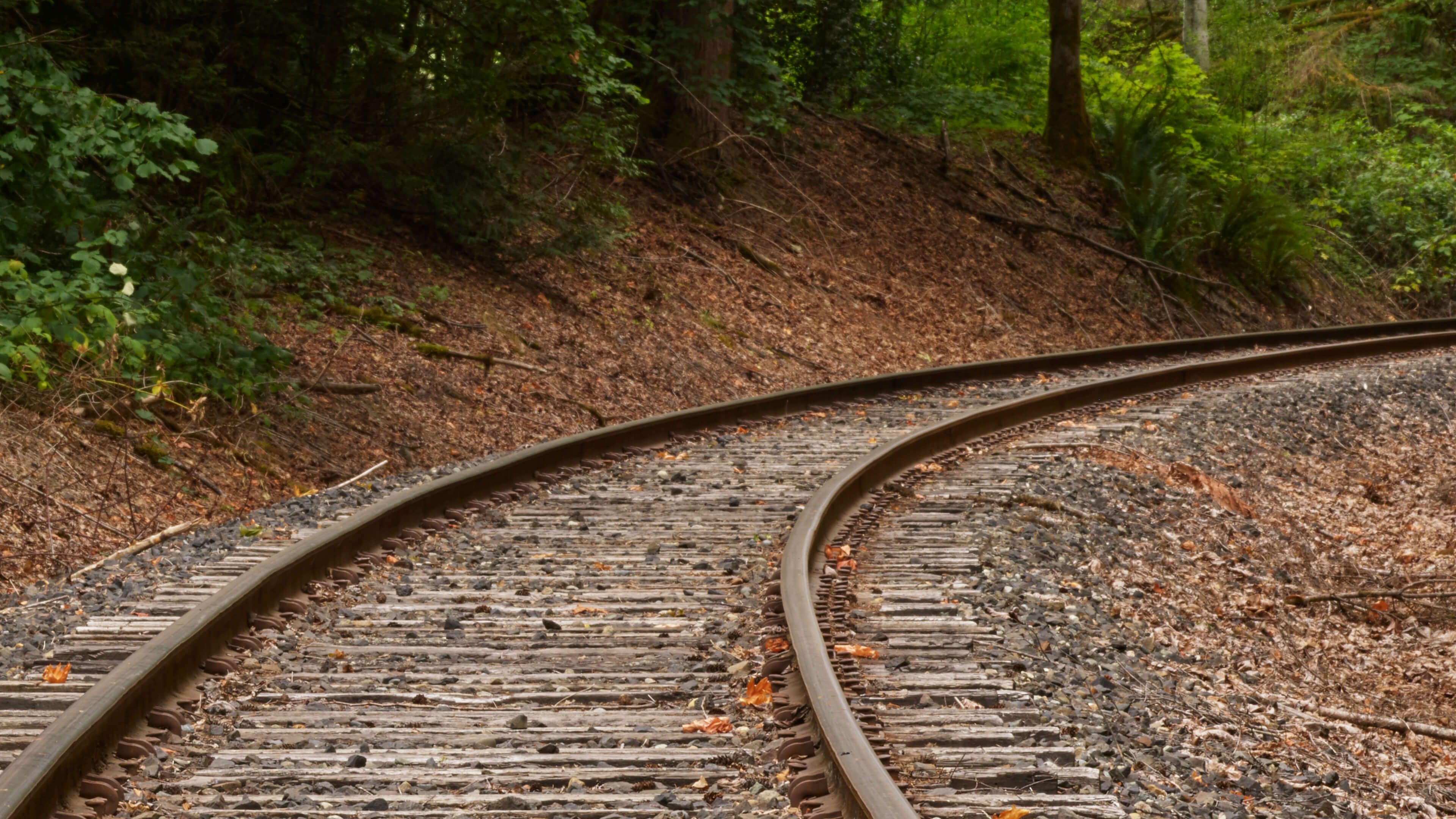 vakret portrettfoto av et gammelt jernbanespor gjennom skogen