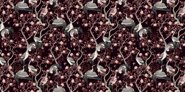 På en rik, mørk bakgrunn utfolder det seg en elegant dans av traner midt i blomstrende blomster. Den grasiøse holdningen til fuglene og det delikate rosa av blomstene danner et klassisk og tidløst mønster som utstråler både ro og bevegelse.