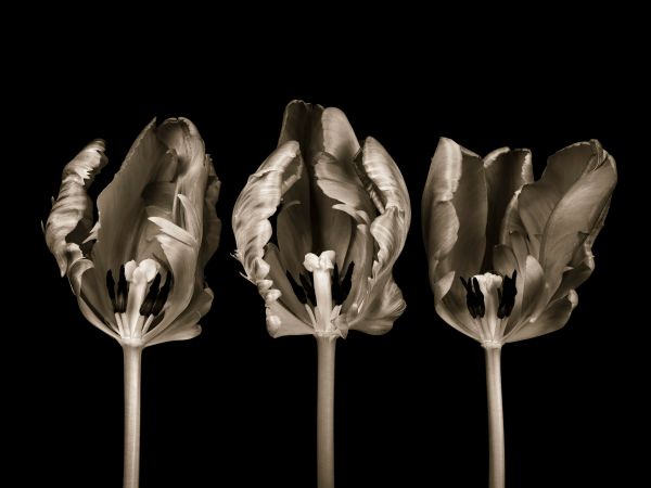 Tre tulipaner på svart bakgrunn. Få mer atmosfære i rommet på en unik måte.