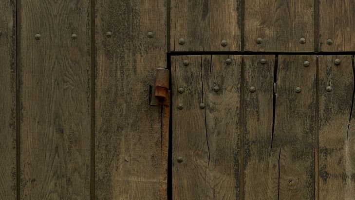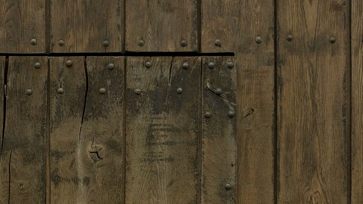 Trevegg med dør. Med dette fototapetet i hjemmet ditt er det som om du kan gå gjennom døren selv.