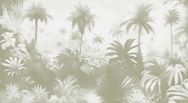 Et beroligende tropisk landskap i myke grønnfarger, med elegante palmer og frodige eksotiske planter. Den tåkete atmosfæren og subtile pastellfarger gir et harmonisk og naturlig preg, perfekt for en rolig og balansert stemning i ethvert interiør.