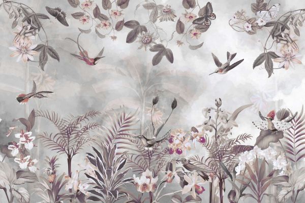 En levende tropisk scene med fargerike blomster, frodige blader og eksotiske fugler som kolibrier. Sommerfugler flagrer subtilt mellom pasjonsfruktblomstene, og skaper en atmosfære av ro og eventyr. Den myke akvarellbakgrunnen gir dybde, mens den detaljerte floraen og faunaen gjør designet raffinert og elegant.
