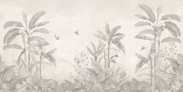 Detaljert blyanttegning av et frodig tropisk landskap med bananplanter, blomstrende busker og elegante kolibrier. De myke gråtonene gir helheten et rolig, raffinert utseende.