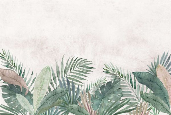 En frodig samling av tropiske blader i myke akvarellfarger som jade grønn, oliven, beige og blush rosa pryder nederkanten av en lys, subtilt teksturert bakgrunn. Frisk, luftig og botanisk raffinert.