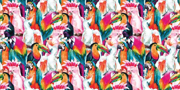 Et muntert og fargerikt mønster av forskjellige akvarellfugler