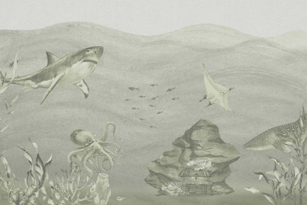 Et vakkert bilde med svømmehaier, en rokke og en blekksprut i grønt.