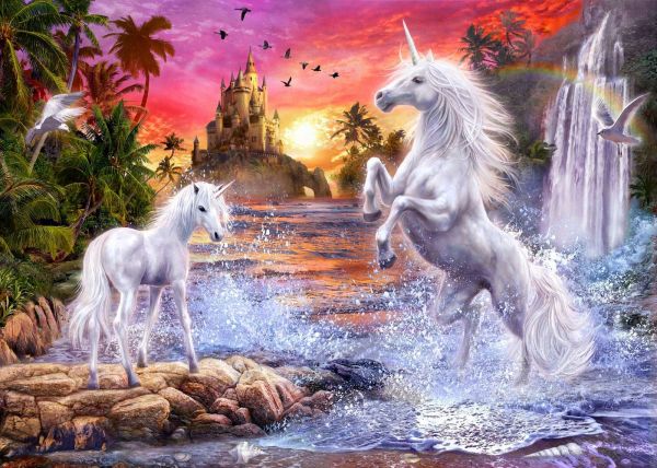 Et strålende scene med en gigantisk enhjørning som reiser seg fra vannet og en ung enhjørning på bredden. Et majestetisk slott, tropiske palmer, en regnbue og et fossefall i varme kveldsfarger danner bakgrunnen.