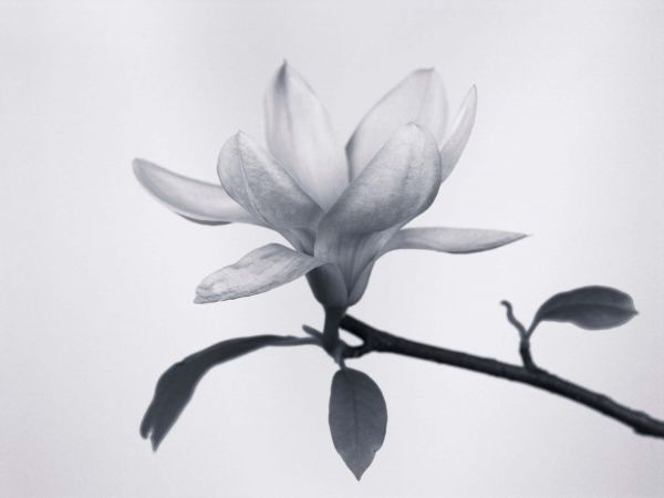 Et nærbilde av en magnolia i svart-hvitt. Fordi bildet er i svart -hvitt, skaper du en fredelig atmosfære hjemme.