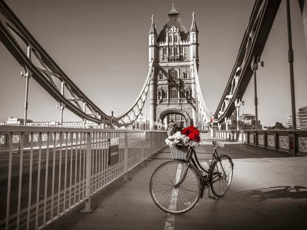 To valper i en sykkelkurv med røde og hvite roser på en bro i London.
