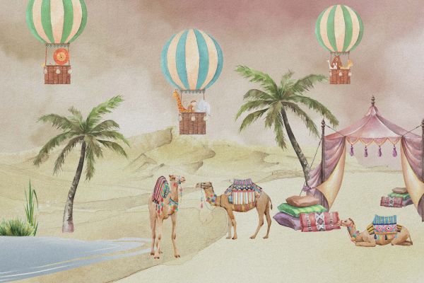 Tre ballonger fylt med søte verdensreisende flyr over ørkenen.