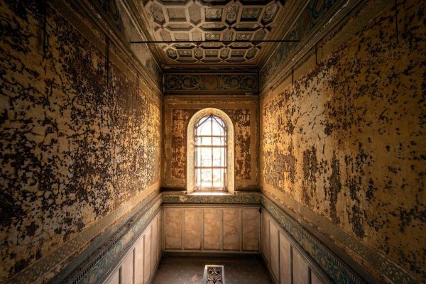 Et stemningsfullt design med slitte gulltoner, flassende maling og historiske detaljer. Kombinasjonen av varm gul, brun og gammel blå gir et nostalgisk preg, som om tiden har satt sine spor. Dette designet fremkaller storheten fra en svunnen tid og tilfører en unik vintage sjarm i hvert rom.
