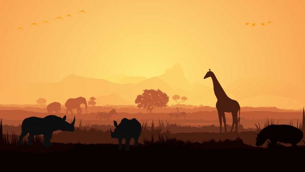 Ville dyrr i savannen med en oransje sol i tapetet.
