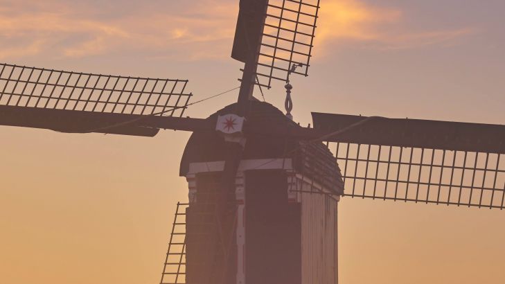 Vindmølle ved en fargerik soloppgang. Himmelen er vakkert farget med en oransje glød på grunn av soloppgangen.