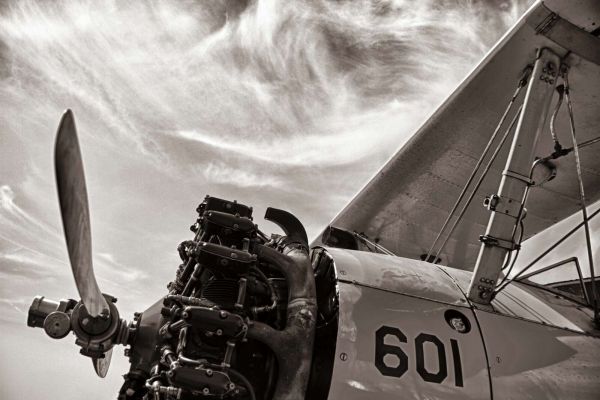 Detaljert svart-hvitt sammensetning av et klassisk propellfly mot et dynamisk skydekke. En kraftig blanding av teknologi, nostalgi og luftig bevegelse.