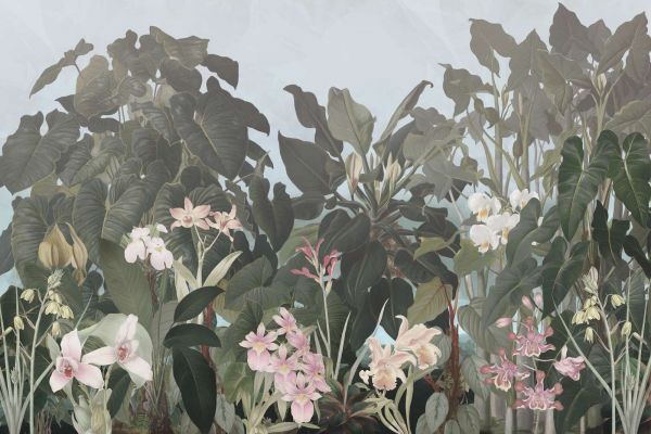 Disse designene puster inn rikdommen og mangfoldet til tropiske landskap. Store, livlige blader danner en tett bakgrunn, der delikate blomster som orkideer skiller seg subtilt ut. Kombinasjonen av dype grønne toner og myke pastell-aksenter skaper en perfekt balanse mellom robust natur og raffinert eleganse. Bruken av farger, som spenner fra subtile sepia-toner til friske blåtoner og grønt, gir en rolig og innbydende atmosfære.