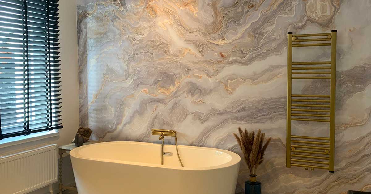 Vi bruker utelukkende PVC-fritt non-woven tapet. Dette materialet har mange fordeler sammenlignet med tradisjonelt papirtapet. Den største fordelen er at det er enkelt å sette opp på veggen. I stedet for å påføre lim på tapetet, påføres det direkte på veggen. Du trenger derfor ikke et tapetbord, og gulvet forblir renere enn med papirtapet.