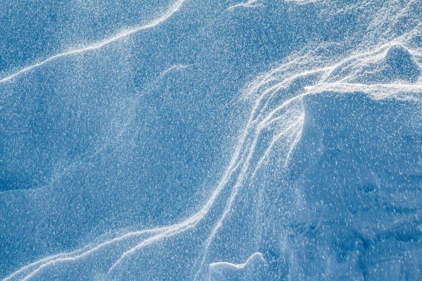 Fint snø daler over en isblå overflate, med subtile linjer og formasjoner som danner et lekent og lett abstrakt mønster. Bildet utstråler friskhet, bevegelse og vinterlig eleganse.