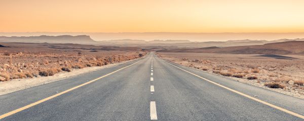 En öde ökenväg i Israel. Vägen tycks fortsätta i all oändlighet och försvinner mellan bergen.