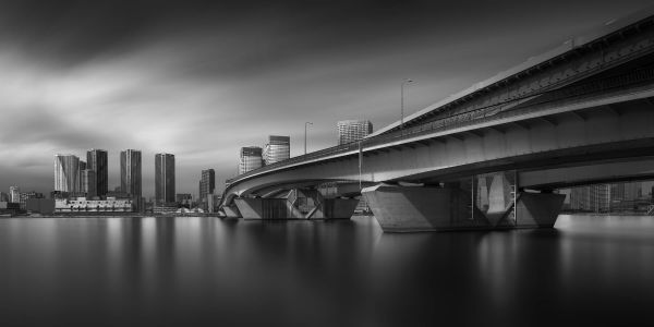 En skyline med höga kontorsbyggnader i svartvitt. Till höger finns en bro som visar vägen till staden.