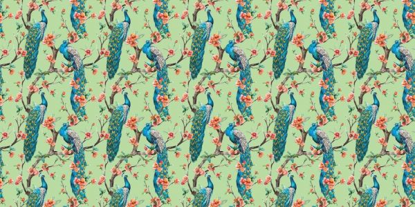 Denna levande illustration visar eleganta påfåglar spridda över en mjukt grön bakgrund, omgivna av blommande trädgrenar med rosa och orange blommor.