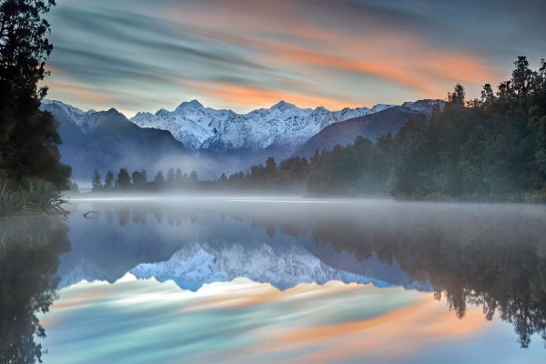 Pastellfärgade nyanser fototapet från vår 1x-kollektion. Landskapets reflektion kan ses i vattnet.