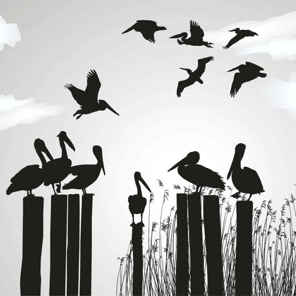 Svartvit fototapet med pelikaner på en pir och flygande pelikaner.