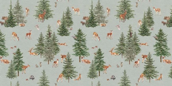 Ett stämningsfullt skogsmönster med hjortar, rävar, björnar och andra skogsdjur, omgiven av majestätiska tallar. Den mjuka bakgrundsfärgen och de detaljerade illustrationerna ger liv åt lugnet i en tallskog, perfekt för att skapa en naturlig och varm atmosfär i varje rum.