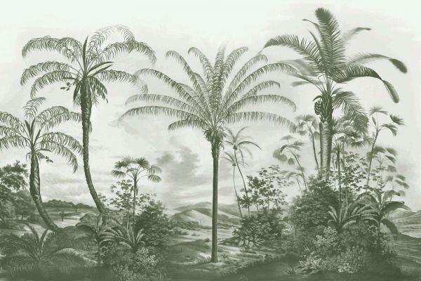 I detta sprudlande scenario står de djupt gröna nyanserna av palmer i centrum, medan subtila pastellaccenter i luften och på kullarna ger en luftig, nästan akvarellaktig finish. Denna kombination av livfulla och mjuka färger skapar ett fräscht och inbjudande tropiskt panorama. Detta design är ytterst lämpligt för interiörer som kan använda lite extra energi och färg. I en boho-stil med rottingmöbler, jute mattor och linnegardiner kommer den botaniska atmosfären verkligen till sin rätt. För en modernare interiör kan du välja stilrena, vita möbler och metallaccenter, så att det gröna palmönstret verkligen framhävs. De friska gröna nyanserna inbjuder till att lägga till riktiga växter eller botaniska tillbehör för att ytterligare förstärka den tropiska upplevelsen. Oavsett om det är i ett vardagsrum, matsal eller hemmakontor: denna tropiska komposition kommer omedelbart att ge liv åt rummet och skapa en positiv, avslappnad atmosfär.