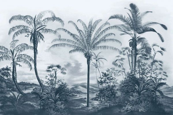 Tropiska palmer badande i svala blå nyanser, som varierar från mjukt turkos till djupt havsblått. Den uppfriskande bakgrunden med böljande kullar och lätta moln andas en lugn, strandliknande atmosfär.